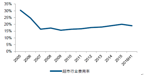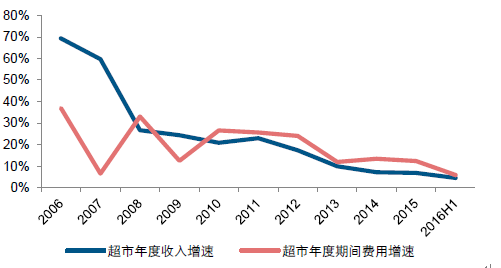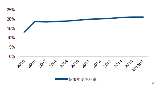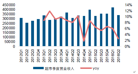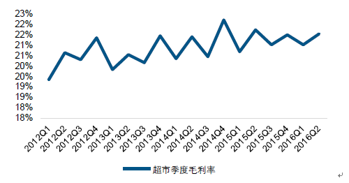 2016年,超市保持4%左右增长,毛利率创历史新高。2016上半年超市收入同比增长4.5%,增速同比下降3.18个百分点。2016年二季度超市营业收入同比增长2.63%,增速环比下降3.42个百分点,同比下降3.81个百分点。受电商加速布局商超o2o及电商物流效率持续提升等因素影响,实体超市企业分流压力日益加大致收入增速持续下滑。