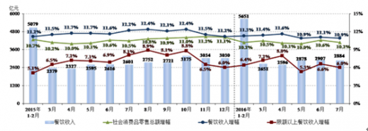 经历过2015年全年强势回暖之后,进入2016年,餐饮市场发展速度减缓并趋于稳 定。2016年1-7月,全国餐饮收入19567亿元,同比增长11.2%,增幅比去年同期回落0.4个百分点。限额以上单位餐饮收入4967亿元,同比增长6.5%,较去年同期下跌0.1个百分点。餐饮收入增速与社会消费品零售总额增幅的差距比2015年底略微收窄至0.9个百分点。