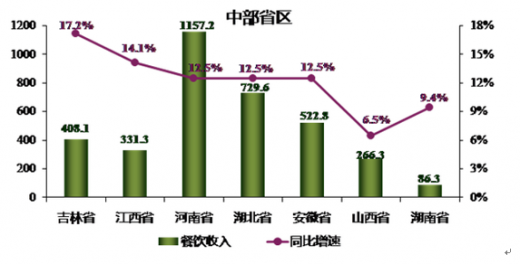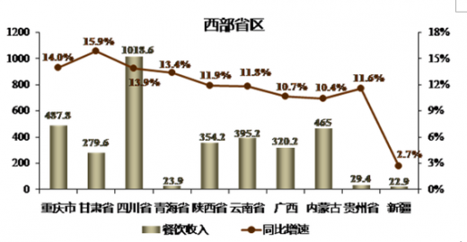 受经济形势下行以及部分地区政策连锁反映的影响,再加上本身餐饮产业规模庞大,一些传统餐饮产业大省区餐饮市场发展步伐都初显放缓迹象,进入稳增长阶段。北京市、山东省、福建省、四川省同比增速上涨幅度都有不同程度的降低,上海市、天津市、广东省、河南省、湖北省等地增速甚至低于去年同期。