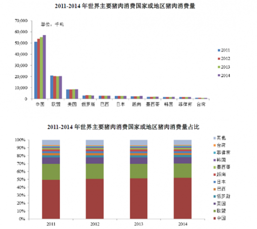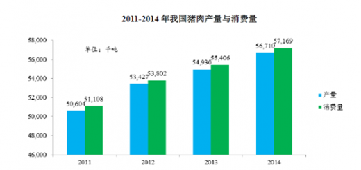 首先,伴随国民收入逐步提升和人口结构转变,国内猪肉消费需求将保持持续增长态势。从国民收入来看,根据国家统计局数据,2014 年中国国内生产总值约635,910.0 亿元,人均国内生产总值46,629 元,城镇居民人均可支配收入为28,843.85 元,农村居民人均可支配收入10,488.88 元。我国是全球猪肉消费第一大国,猪肉是我国居民最主要的副食品,猪肉消费长期占肉类消费比重60%以上。