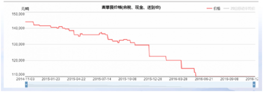 1. 目前价格为11万元/吨,价格下跌主要原因是需求端不振,美国麦草畏混配制剂审批进度低于预期,麦草畏需求缺乏新的增量,同时扬农化工5000吨新增产能投放,供应增加,供过于求,供需错配,价格下跌; 2. 耐麦草畏大豆和麦草畏制剂获批,未来有望量价齐升;