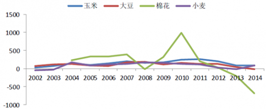 2002-2014年中国主要粮食作物每亩净利润(元)