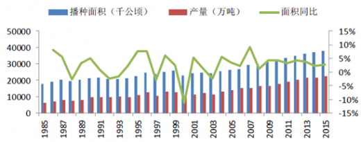 1985-2015年中国玉米播种面积、产量及播种面积增速