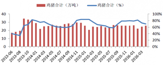 玉米下游需求主要分为三大块,其中饲料方面占比超70%,其他二块分别为深加工方面和食用等方面。从全价饲料产量图中可以看出,鸡、猪饲料在饲料产量中的占比是最高的,因此鸡、猪的养殖情况是玉米下游需求的最强影响因素。