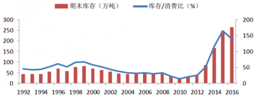 4、最低收购价通过指定企业托市收购,托起市场粮价,当市场粮食价格稳定在最低收购价之上即停止托市收购。但是在实际收购中,收购企业在多收购多赚取保管费等利益驱动下存在敞开收储的倾向,导致农产品的库存大幅上升。国内玉米库存量自2010年以来快速增加,库存消费比远高于全球平均水平。