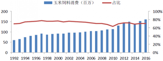 3、受临储政策支撑,国内玉米种植的相对收益较为可观,种植面积增长迅速。2000-2015年,国内玉米产量由1.06亿吨增长至2.25亿吨,播种面积由3.46亿亩增长至5.72亿亩。其中在2012年,玉米产量首次超过水稻,成为我国第一大粮食作物品种;2014年,我国超越美国成为玉米种植面积最大的国家。