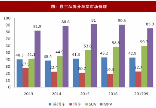 suv是自主品牌最具竞争力的细分产品。从车型来看,传统轿车的市场份额从2013到2017年9月分别是27.5%到22.7%,不升反降;mpv从2013年的81.9%上升到2016年的90.5%,再下降至2017年9月85.3%;只有suv从2013年的41.1 17年9月的59.7%,多年连连续上涨,是各大自主品牌的主要竞争市场。