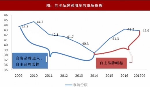 截止2017年9月,自主品牌的市场份额已达到42.9%,与去年的43.2%相比略低,主要由于:①购置税减半政策退出的影响,自主品牌车型多进入1.6l及以下中低端车款,购置税的退出减低了目标消费者的购买欲望;②消费升级,随着gdp的增长,国民消费需求提高,不满足于传统15万或10万以下中低端车型,向更佳的消费体验迈进。而这一领域合资品牌已深耕多年,具备车型车款、销售售后等多方优势,自主品牌在车型开发、爆款推出上仍需时日。