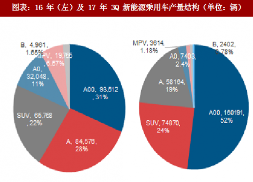 目前国内小微型(a00/a0)纯电动占新能源乘用车产量比例超过 55%,主要原因在于该类车型补贴后经济性较强,在三四线市场、租赁市场有所突破,但难以代表未来消费市场真实需求。参照成熟的燃油乘用车市场, 16 年及 17 年前十月国内小微型乘用车销量合计占比分别仅 6.4%和 5.7%,我们判断随着新能源乘用车技术进步及消费市场崛起,车型升级是大势所趋。