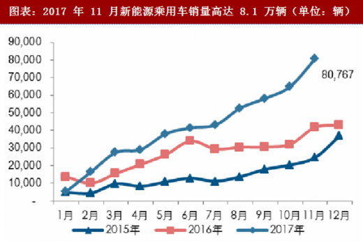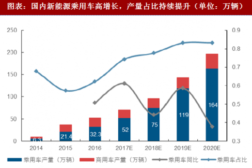 2017 年新能源乘用车产销高增长,1-11 月产量高达 45.4 万辆,同比增长 62%;且成长空间依旧巨大,以全年产量 54 万辆预计,目前乘用车电动化率仅 2%;新能源车积分从 2019 年开始考核,油耗积分现在已经开始追溯考核;为了应对双积分考核压力,预计 2018 年合资及自主品牌车企将加速布局新能源乘用车,当年产量有望超过 70 万辆。