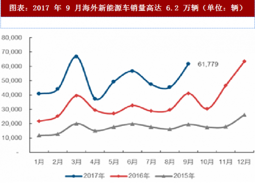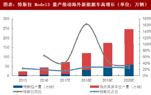 2017 年前三季度海外新能源车产量达 45 万辆,同比增长 63%,其中 a 级及以上乘用车占比超 95% 以上,预计全年产量约 70 万辆,对应海外市场渗透率约 1.1%。2018 年是特斯拉 model3 大规模量产的年份,按公司一季度末月产能 2 万辆规划,全年产量预计可达 20 万辆。