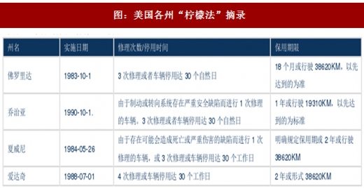 上世纪70年代,美国厂商生产的家电、汽车等商品故障多,返修高,商推诱售后责任,消费者怨声载道。1975年杰拉尔德福特总统签署“马格努森一莫斯保修法”,要求制造商明确保修条款,履行保修义务。1982年以后,美国各州以“马格努森一莫斯保修法”为蓝本,相继颁布“柠檬法”,对于返修3}4次仍无法解决的车辆,主机厂/经销商有义务购回。