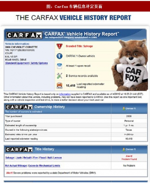 第三方中介方面,美国有许多专业服务公司为消费者和经销商提供车况信息、担保、保险、评估等服务。例如carfax,autocheck等等。carfax是一个公开、公正的车辆信息平台,是由ewinbarnettiii和robertdanielclark于1984年共同建立,目的是为了打击里程欺诈。carfax从10万个数据源中收集到超过170亿条数据记录,涵盖了车辆的保险、维修、事故等信息。消费者可以根据车辆vin码,查询车辆历史信息。通常查询一份报告的费用在1040美元/份不等。