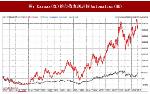 美国最大的零售二手车商carmax,成立于1993年。公司首次将百货零售的理念引入二手车销售中,消除二手车的信息不对称痛点。虽然收入与autonation相当,但目前市值达到123亿美元,远超过autonation50亿的市值规模。