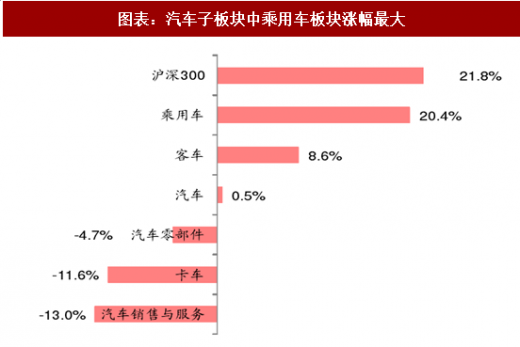 2017年年初至年底(12月29日收盘),按中信分类,汽车板块指数上涨了0.55%,在29个行业中排15位,市场表现中等。同期,沪深300上涨21.8%,汽车板块跑输21.2个百分点。