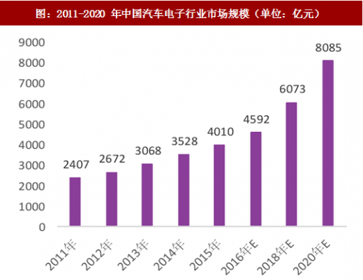 汽车电子将从中高端车型向中低端车型普及。随着技术的进步以及成本的降低,未来越来越多的汽车电子控制装置,例如发动机牵引力控制系统、车身电子稳定系统、自适应巡航系统等将从高端豪华车型逐步向中低端车型渗透,车载导航、车载影音系统等也将越来越多的成为汽车的“标准配置”。中低端车型的汽车电子占比会得到提升。明年汽车的红海竞争催生了汽车电子向低端下沉,从而提升产品的竞争力。从目前市场占有率上看,国产汽车电子类产品仅占到汽车电子的 20%左右,且多为车载娱乐类产品,未来随着汽车智能化、网联化的发展,汽车电子将在低端车上有更多配置,并且在高端车上游产品价格提升的逻辑。根据欧立信研究,我国汽车电子 2018 年约为 6000 亿的汽车电子市场规模,到 2020 年汽车电子的规模将达到 8000 亿元,复合增速超过 10%,将是汽车销量增速的二倍。