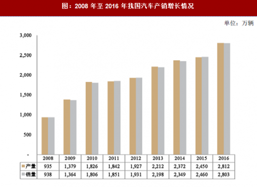近年来,我国汽车行业在技术和市场方面取得了重大突破和发展。随着工业技术水平提高和汽车产业集群效应,我国正逐渐成为世界汽车制造中心。2009 年,我国汽车总产量达到1,379.10 万辆、总销量达到1,364.48 万辆,超过美国成为全球最大的汽车生产国和消费国。2010 年汽车产销量双双超过1,800 万辆。2010 至2012 年,由于北京等大城市的限购措施的实施以及用车成本的增加等原因,我国汽车市场的增长速度有一定放缓。2013 年我国汽车产销量又重新恢复两位数的增长率,总产量达到2,211.68 万辆,销售量达到2,198.41 万辆。2016 年我国汽车产销量分别为2,811.88 万辆和2,802.82 万辆,同比增长14.46%和13.65%。