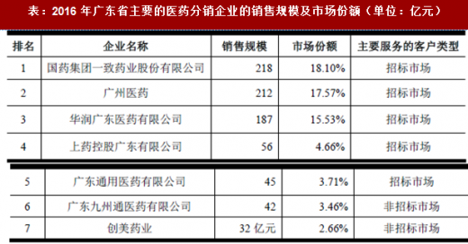 根据标点信息《中国医药流通行业市场研究报告》(2016),广东省内主要的医药分销企业的销售规模及市场份额如下表: