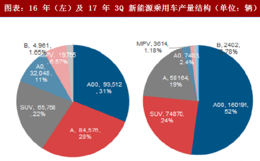 1)国内纯电动乘用车结构升级潜力巨大。2017 年国内小微型(a00/a0)纯电动占新能源乘用车产量比例超过 50%,主要原因在于该类车型补贴后经济性较强,在三四线市场、租赁市场有所突破,但难以代表未来消费市场真实需求。参照成熟的燃油乘用车市场,2016 年及 2017 年前十月国内小微型乘用车销量合计占比分别仅 6.4%和 5.7%,我们判断随着新能源乘用车技术进步及消费市场崛起,车型升级是大势所趋。