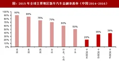 图:2015年全球主要地区新车汽车金融渗透率(中国2014-2016)