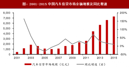 图:2001-2015中国汽车信贷市场余额规模及同比增速
