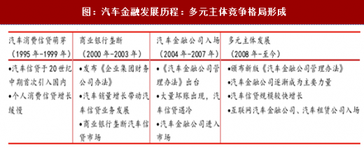 4.多元主体发展(2008年-至今):随着上海通用金融公司的成立,大众汽车金融公司、丰田汽车金融公司等国际汽车金融市场主要玩家入场中国,带入新的业务模式和风控技术。2008年,新版《汽车金融公司管理办法》颁布,为中国汽车金融业的快速发展创造了条件,打开多元竞争的局面。汽车金融公司逐渐成为市场主体,渗透率不断提高。2013年,互联网金融兴起,多元主体入场。消费金融概念席卷汽车市场,国外汽车电商也进入中国,互联网汽车金融公司和汽车租赁公司作为新兴力量进入市场。至此,商业银行、汽车金融公司、汽车租赁公司、互联网汽车金融公司多元主体并存的局面逐渐形成。