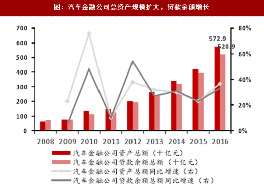 汽车金融公司的总资产、贷款总额在过去的三年中都以较快速度增长。仅2016年中国汽车金融公司资产总额就达到5,729亿元,同比增长36.7%,其中前8公司的资产达3,527亿元,占比为62.4%;贷款总额为5,209亿元,同比增长33.2%。