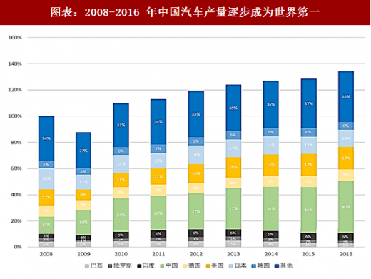 图表:2008-2016 年中国汽车产量逐步成为世界第一