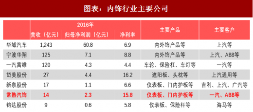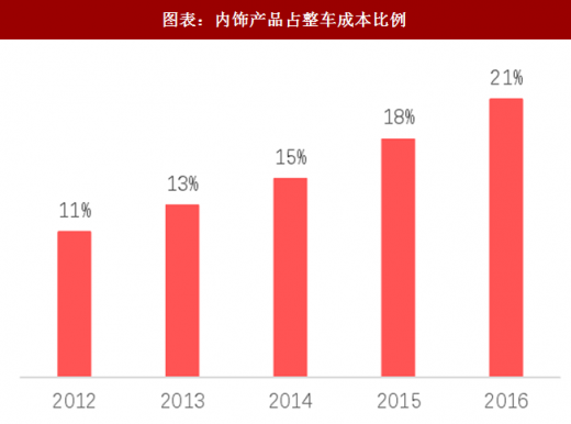 整车厂均在加速配置汽车内饰产品。2012~2016年,内饰产品占整车成本比例不断提高,目前内饰占整车成本已经超过了20%。