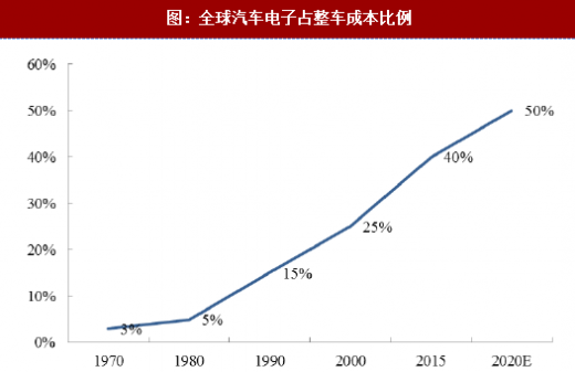 根据中投顾问产业研究中心的数据,汽车技术70%左右的创新源自于汽车电子,汽车电子技术的应用程度已经成为衡量整车水平的主要标志。根据中投顾问产业研究中心预测,全球汽车电子占整车价值比重预计将由2015年的40%上升到2020年的50%。目前,对于不同类型汽车,汽车电子在整车成本中的占比不尽相同,其中在紧凑型乘用车成本中的占比达到15%,中高端乘用车占比达28%,混合动力乘用车占比达47%,纯电动乘用车占比达65%。