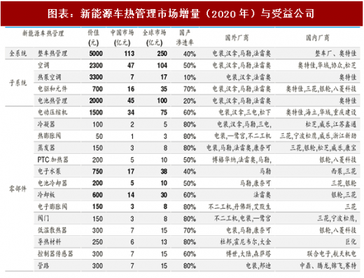 随着单车载电量的增加和电池能量密度的提高,且热管理系统不仅影响电池寿命和续航能力,也在很大程度上影响到安全,重要性越来越高。国内供应商依靠我国对于汽车的政策红利、财政补贴以及整个产业联动,利用本土优势及传统业务支持,迅速抢占热管理的市场;具有关键零部件配套能力、系统集成能力的供应商,会占据行业优势地位,拿到大部分的市场与利润,并随着市场的发展从而得到良性发展,继而渗透进入全球市场。