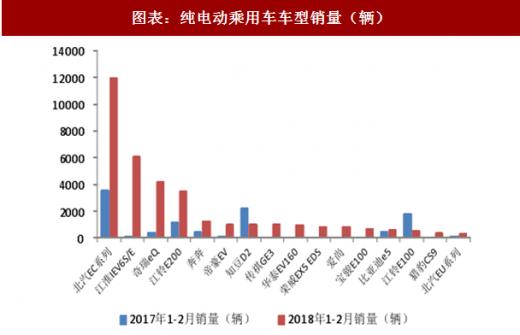 1-2 月纯电动乘用车车型中销量较高的为北汽 ec 系列、江淮 iev6s/e、奇瑞 eq、江铃 e200 等,插电式混合动力乘用车车型中销量较高的为比亚迪的宋 dm、秦,以及荣威的 erx 5 和 i6。