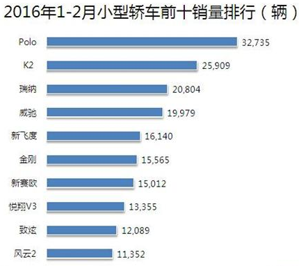 然而,从前十畅销车来看,小型车市场格局又是另一番情形。今年1-2月,小型轿车市场前十车型依次是polo、起亚k2、瑞纳、威驰、飞度、金刚、赛欧、悦翔v3、致炫和风云2。