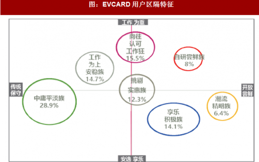 根据一项针对evcard用户区隔的研究,分时租赁用户可以分为七大类型:中庸平淡族、向往认可的工作狂、工作为上的安稳族、享乐积极族、挑剔实惠族、自研尝鲜族和潮流精明族,如图2所示。