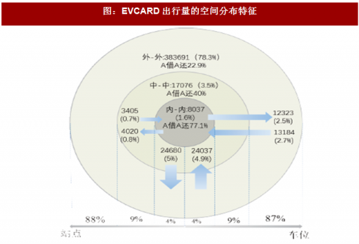 从周变特征来看,分时租赁周末用车量高于工作日,周六最高,周一最低。从一天24小时的时变特征来看,与整体交通出行时间分布不同,分时租赁白天12小时未出现明显的用车高峰,出行量分布较为平均。另外,分时租赁夜间出行比例显著高于整体出行水平。夜间22点至凌晨6点,evcard出行量占其全日出行量的25%左右。