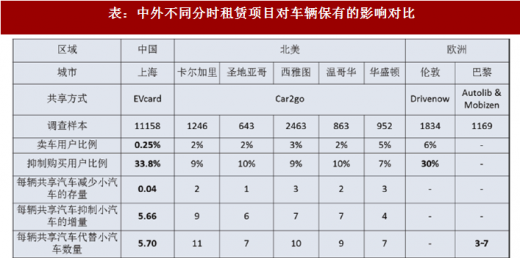 基于evcard对车辆出售与车辆购买抑制的作用,比较中外不同分时租赁项目对保有的替代效益。可以看到,上海分时租赁项目已经显现出对保有的替代效应(卖车、放弃买车、延迟买车),每辆分时租赁车可替代5~6辆私人小汽车。与欧美国家相比,上海分时租赁的替代效应主要表现在对车辆购买的抑制作用,即对增量的调控。存量替代效应显著低于欧美国家水平。