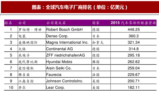全球汽车零部件百强企业基本上都涉及汽车电子业务。在《美国汽车新闻》公布的 2016 年度全球百强汽车零配件供应商名单里,前十名分别为博世 集 团 (bosch) 、 电 装 (denso) 、 麦 格 纳 国 际 (magna) 、 大 陆(continental)、采埃孚(zf friedrichshafen)、现代摩比斯(hyundai mobis)、爱信精机(aisin)、佛吉亚(faurecia)、江森自控(johsoncontrols) 和李尔(lear)。这些企业的汽车电子产品线较广,并占据着中高端市场,具备较大的附加值。