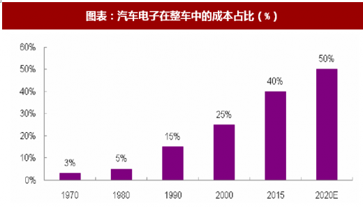 得益于行业的快速发展,汽车电子在整车中的占比不断提高。汽车竞争日趋白热化,汽车电子智能化已然成为全球汽车产业技术领域的发展重点和产业战略新兴增长点。随着汽车行业的不断开放,汽车电子技术发展的进程,参与的主体也变得更加多元化,技术内涵也在不断丰富。电子电器在汽车产业应用逐渐扩大,市场整体呈现稳步上升趋势。根据中投顾问产业研究中心预测,汽车电子在整车中的成本占比,已经由 1970 年的 3%提升至 2015 年的 40%,2020 年有望进一步达到 50%。