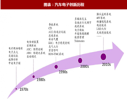 汽车电子至今已有数十年的发展历程,技术创新层出不穷,产品更新周期不断缩短。最早将电子技术应用于汽车工业的时间,是上世纪七十年代。当时在发动机燃油喷射控制系统中率先采用电子技术,极大地提高了燃油效率。从此以后半导体开关、微处理器、传感器等新兴电子技术,不断应用在汽车工业中,驱动产业的创新发展。上世纪九十年代后,数字技术也得到应用,汽车整体的智能化水平不断提高。汽车电子逐渐替代机械发挥作用,汽车电子系统愈发精密复杂,现代汽车已成为高度机电一体化的产物。2010 年后,汽车电子行业加速推陈布新,胎压监测系统、48v 系统、碰撞避免系统、线控技术、led 大灯、无线连接技术等新兴产品不断涌现。
