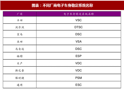 车身电子稳定系统是由博世公司于上世纪 90 年代推出的专利产品,因此只有博世公司的车身电子稳定系统才称之为 esp。但实际上,提供车身电子稳定控制系统的厂家有很多,并不止博世一家,我们把其他厂商生产的电子车身稳定系统统称为 esc。由于不同汽车生产厂商采用不同车身稳定系统厂家的金沙下载送彩金的解决方案,导致了各厂商对其 esc 系统的命名不一致。