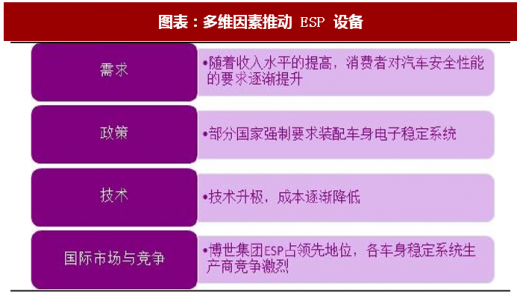 多维因素助力未来 esp 安装率提升。esp 被称为是“汽车安全领域继安全带之后最具拯救生命潜力的科技”。由于技术先进,esp 能有效降低事故发生率,逐渐受到政府各界的重视。早在 2011 年,美国和欧盟就立法强制安装车身稳定系统;随后,欧洲于 2014 年 11 月起一律强制性要求所有乘用车和轻、中和重型车辆装配车身稳定系统;日本和韩国的装配率也高于世界平均水平。中国目前尚无强制装配法规,普及率相对较低。随着消费者收入水平和安全意识的提高,esp 电子稳定系统已经引起越来越多消费者的重视。