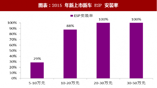 据盖世汽车数据,通过对 2015 年上市新车型分析,esp 逐渐向中低端车型渗透,10 万以上车型安装率过半,20 万以上安装率达 100%。
