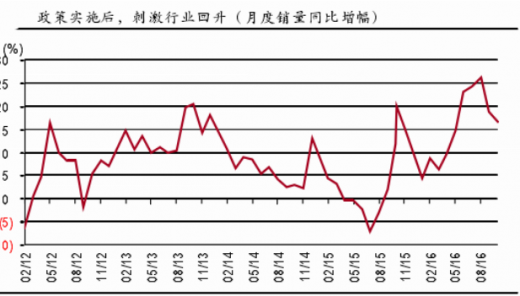 在 2015 年 10 月 1 日开始实施的 1.6 升及以下排量乘用车购置税减半政策的刺激下, 2015 年第四季度销量触底反弹开始出现大幅增长后,2016 年延续高增长趋势。2016 年 1-11 月,1.6 升及以下乘用车销售 1562.8 万辆,比同期增长22.5%,占乘用车销量比重为 72.1%,比上年同期提高 3.8 个百分点,政策效果显著。