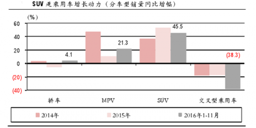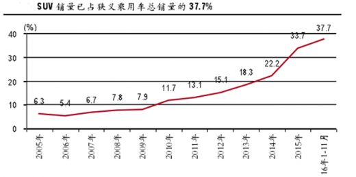 2016 年 1-11 月 suv 销量 793.9 万辆,同比增长 45.5%,已占狭义乘用总销量的 37.7%。