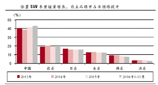 凭借 suv 车型销量大幅增长,2016 年 1-11 月自主市占率恢复至近 5 年的新高,达到 42.7%。除自主品牌市占率有所提升外,德系、美系、日系、韩系和法系均有所下滑。