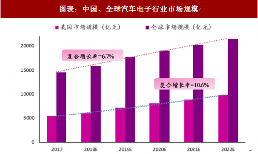 汽车电子技术在不断发展,同时技术内涵也变得越来越丰富。我国汽车电子规模持续增长,2017 年为 5400 亿元,与 2016 年相比增长 17.6%。根据产 业网的预测,2017 年到 2022 年,中国汽车电子市场将以 10.6%速度增 长,增速超过全球。