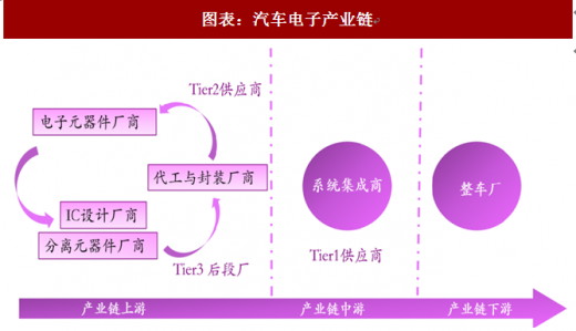 汽车电子产业链由三大部分组成:上游为汽车电子元器件厂,主要负责提供汽车电子的相关核心芯片及其他分立器件,而代工与封装厂商(tier3后段厂)为其提供代工及封装服务。