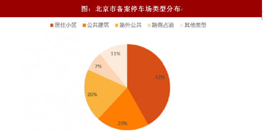 根据 2017 年北京市交通委发布停车资源普查报告,停车场类型可分为以下九类:居住小区(42%)、公共建筑(20%)、路外公共停车场(20%)、路侧占道(6%)、平房区、立交桥下空间、驻车换乘停车场、混合区域(含商住楼等)、其他。