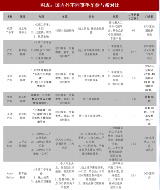 对比国内外事手车市场主要参与斱,由于汽车经销商具备多渠道的事手车来源,未来有望与事手车电商展开合作,向后者批収拍卖事手车。在豪华品牌事手车零售领域,广汇汽车、中升控股、永达汽车等主要豪车经销商拥有原厂认证和完善的售后维保体系,其优势将是事手车电商平台与传统事手车卖场难以比拟的。