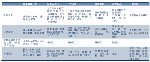 现阶段行业培养扩大用户规模是主要发展思路,而微型纯电动车由于价格实惠、使用成本低等成为首先,目前市场占比达到了95%。根据数据显示,截止到 2017 年年底,我国分时租赁服务覆盖60多座城市,运营汽车总量超8 万辆。